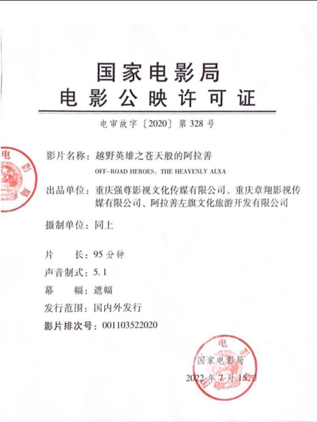 出 品:重庆强尊影视文化传媒有限公司、重庆章翔影视传媒有限公司、阿拉善左旗文化旅游开发有限公司