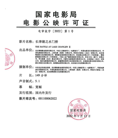 出 品:北京博纳影业集团有限公司、中国人民解放军八一电影制片厂、华夏电影发行有限责任公司、中国电影股份有限公司、上海电影(集团)有限公司、阿里巴巴影业(北京)有限公司、北京登峰国际文化传播有限公司